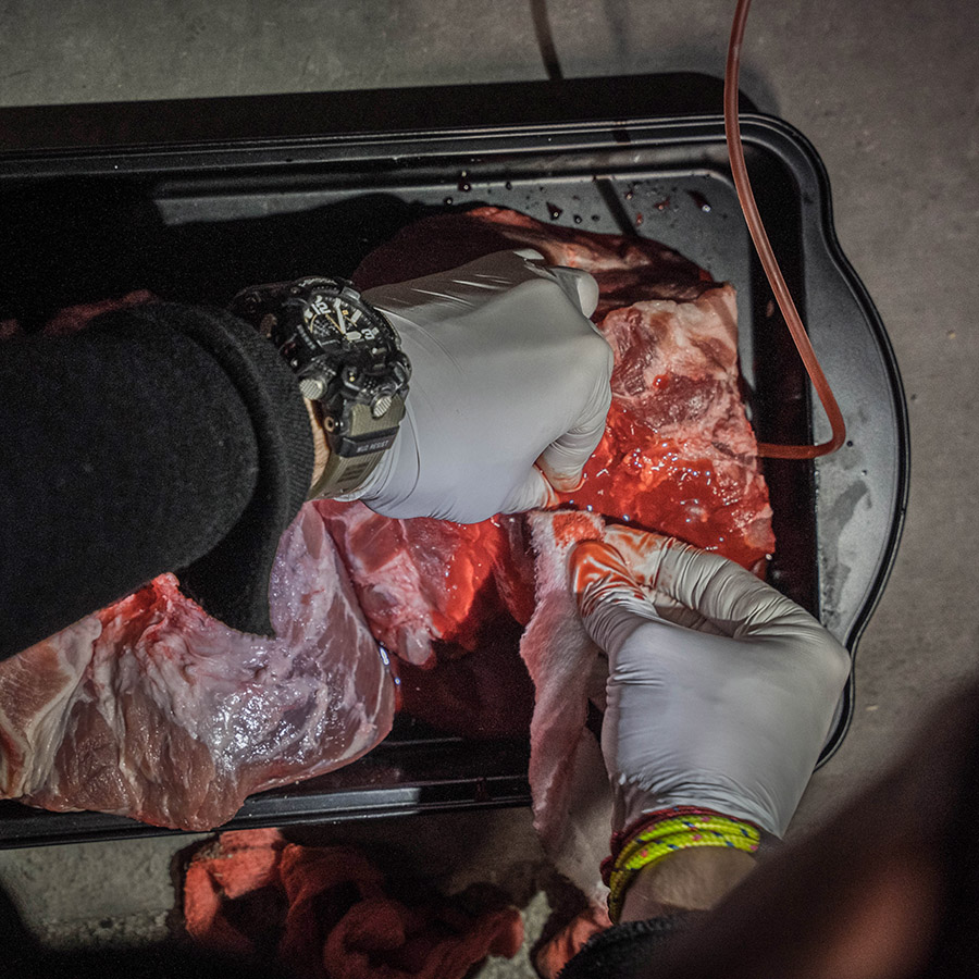 - Verwendung von mit Kunstblut versorgten Trainingsdummies und Wundsimulatoren.